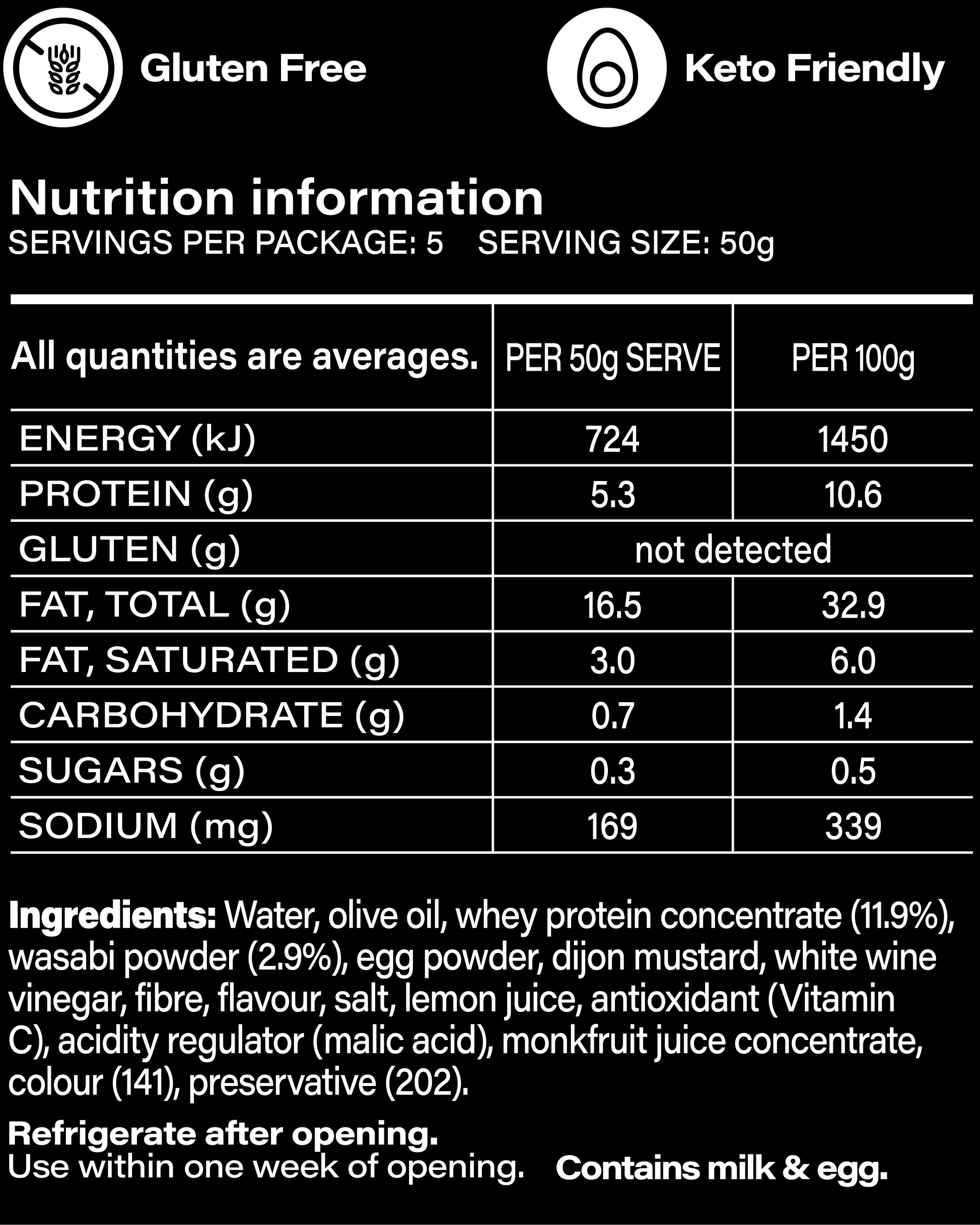 Smooth, creamy, and just the right kick of wasabi heat. Muscle Sauce Wasabi Mayo delivers 27g of protein per jar, crafted with olive oil, whey protein, and clean, low-FODMAP ingredients for a flavour that’s gentle on the gut. No gluten. Sugar free. No filler — just clean, high-protein power that fuels performance and taste in every spoonful.